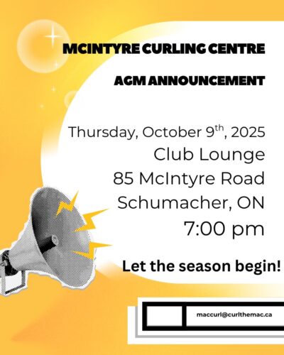 Annual General Meeting Come out to hear from your Board of Directors on Thursday, October 9th about club activities and plans! By McIntyre Curling Club|2025-10-12T00:51:55-04:00July 29, 2025|Club News| Share This Story, Choose Your Platform! FacebookXBlueskyRedditLinkedInWhatsAppTelegramTumblrXingEmailCopy Link About the Author: McIntyre Curling Club Related Posts Angler’s Open Bonspiel Gallery Angler’s Open Bonspiel Canadian Under-18 Curling Championships Gallery Canadian Under-18 Curling Championships U-18 Championships Program Gallery U-18 Championships Program U-18 Canadian Curling Championships Sponsor – Agnico Eagle Mines Limited Gallery U-18 Canadian Curling Championships Sponsor – Agnico Eagle Mines Limited